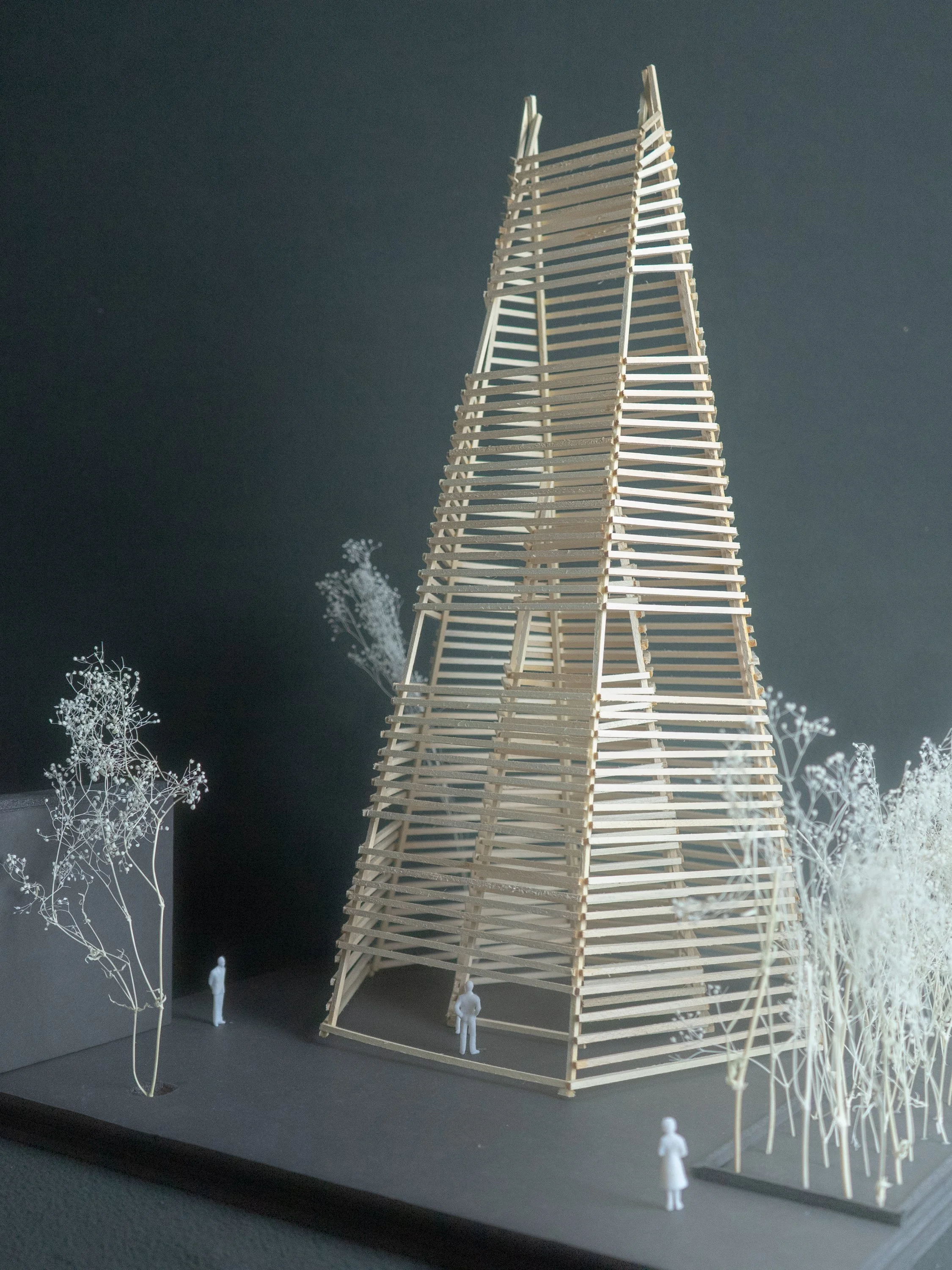 The concept behind this project was to create a physical wooden dowel model adjoined with foam board and baby’s breath for vegetation, to create a temporary space that would be placed on the University’s Campus as an art installation. The design of the model was to be inspired by peculiar and intricate wildlife creatures in which the word “MONSTER” was utilized as a substitute due to the assigned creatures unique appearances as well as abilities. Hence the play on words in the title of the project (de[MONSTR]ative). I was assigned the Deep-Red Jellyfish also known as the Crossota Norvegica. I studied and analyzed the movements of this particular jelly fish and came across two ideas that led me to this design implementation. When a jelly fish moves through the waters of the sea all of it’s tendrils move in conjunction propelling the jelly fish towards it’s desired direction. I was able to illustrate that in this model using the supporting dowels upward projection towards the sky, representing movement and direction. The second idea were the layers of the jelly fish. Jellyfish are comprised of three layers. The layers on Deep-Red Jellyfish are easily identifiable that being the translucent outer surface layer that serves as a protection barrier called the epidermis, the red interior layer mesoglea, and the final layer the gastrodermis. I sampled this by creating an identical wooden dowel model smaller in scale that would fit within the larger wooden dowel model. With this I was able to create a space within a space, within another space, simulating that same idea of layering.