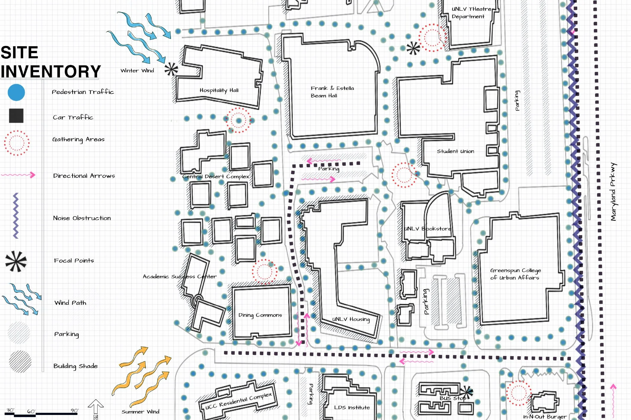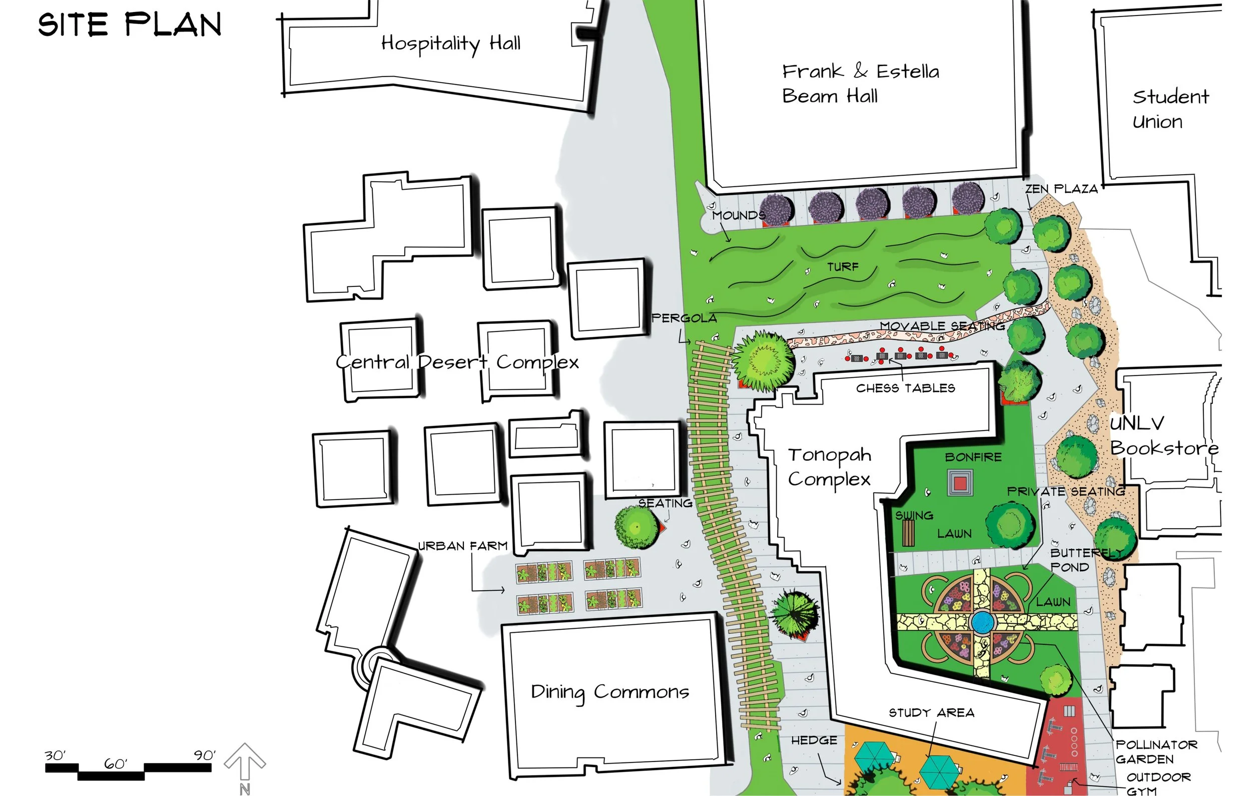 The concept for this project was to reimagine the existing University of Nevada Las Vegas student housing area through site inventory, site analysis, and applying Catherine Dee’s book Form and Fabric in Landscape Architecture. The site encompasses the dining commons all the way to the Student Union. When designing this concept I visited the student housing and analyzed the existing conditions taking note of the surrounding area. It was noticeable that the students did not use the outdoor space provided to them and it was mainly used as an area of traffic transitioning from one space to the next. There was nothing there that activated the space or allowed individuals to slow down and take the time to appreciate that side of the campus. I wanted to activate the space by creating more gathering areas by allocating more space to pedestrians and removing parking near the Frank & Estella Beam Hall building. Inspired by Maya Lin’s wave field I incorporated a field that would become a new hub for students close to the student union, dorms, and dining. I also sought other avenues for how to activate the space and studied landscape architect Hideo Sasaki’s work in New York. I incorporated a trellis that would create a visual appeal and shaded walkway from the sun as well as other amenities to grow and create a student community rather than a stop and go destination.